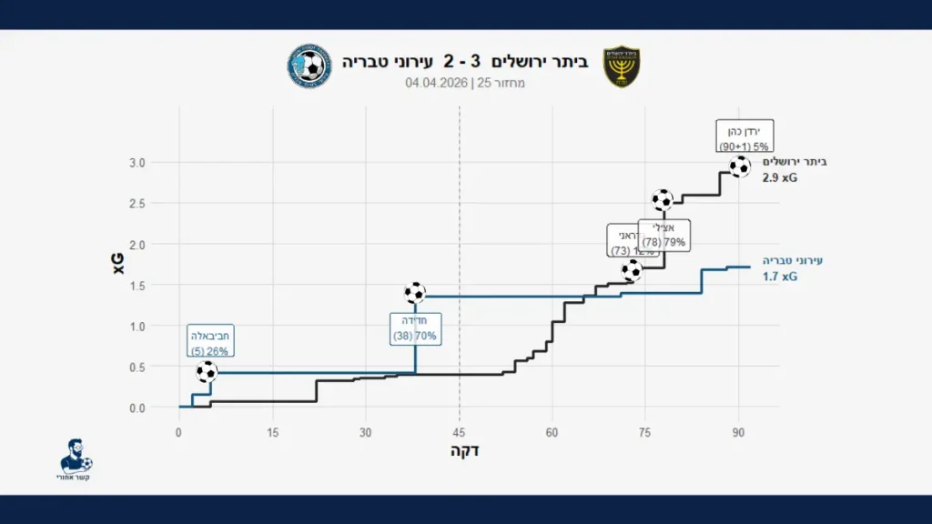 גדראני שבר את התבנית משער עם 12% סיכוי, וארבע דקות אחר כך הגיעה הטעות שבית"ר חיכתה לה כל המשחק. שועה באחת מהמסירות האופייניות שלו, גונסאלס אולי היה עושה משהו עם הכדור הזה ואולי לא, אבל הדבר האחרון שהיה נחוץ לטבריה זו היציאה של עידו שרון שהכשיל את החלוץ הקולומביאני. מכאן זה 2-2 ו-15 דקות בהן הכל יכול להתרחש.