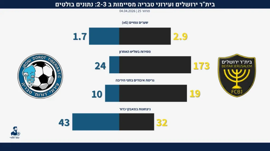 הבעיות התחילו בסגל: אוסמן נסע לאליפות אפריקה וגם לא הצליח להישאר בקו הבריאות, סמביניה מסדר ליריבות יותר מצבים מאשר מונע מהן ושוער הרכש הפורטוגלי התגלה כמסננת. ועדיין, מול בית"ר ראינו מהקבוצה הזו את הפונטציאל שמבדיל בינה ובין חלק מקבוצות התחתית: למרות 20% החזקה בכדור, ההגנה, בראשות רון אונגר שסיים עם 6 תיקולים ו-7 חילוצי כדור, הצליחה למנוע מהמארחים להגיע למצבים במשך מחצית שלמה (חוץ מהנגיחה של גונסאלס). ההתקפה ניצלה שתי טעויות של בית"ר. אלו לא המשחקים שטבריה תיבחן בהם וגם לא המשחקים שהקבוצה הזו אמורה להוציא בהם נקודות, אבל ביום שבת האורחים עשו כל מה שהם רק יכלו לעשות.