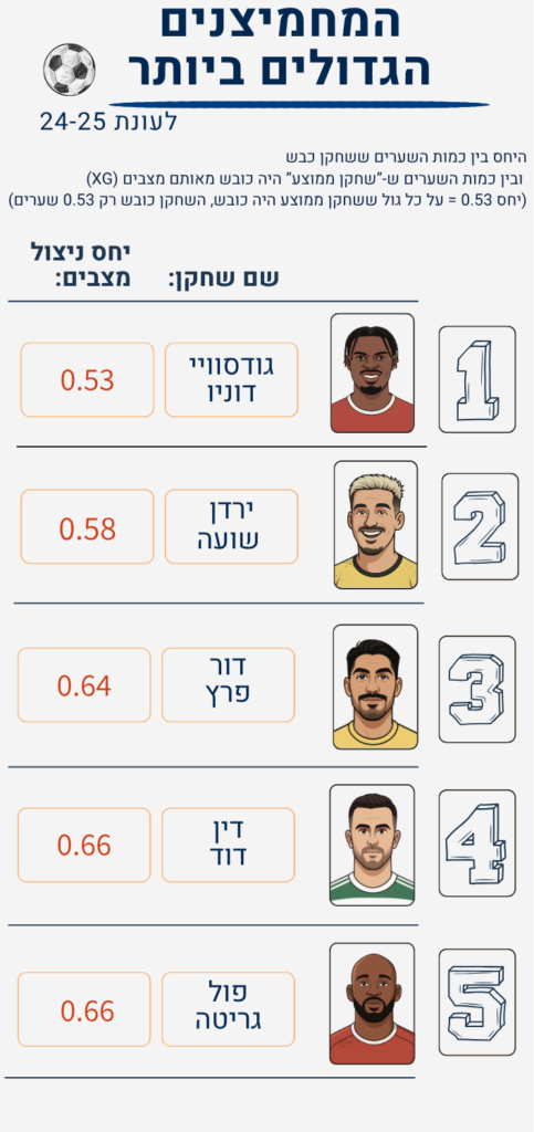 התשובה היא חד-משמעית כן. למשל – דין דוד החמיץ העונה לא פחות מ-11 הזדמנויות עם XG של 40% ומעלה. ההחמצה הזכורה ביותר קרתה במחזור ה-30 מול מכבי תל-אביב, דקה 76: בעיטה מ-13 מטר, השוער כמעט לא בתמונה ורק הצלה מטורפת של רז שלמה מהקו מנעה שער (לפי ה-XG, ב-60% מהמקרים המצב הזה מסתיים בשער).