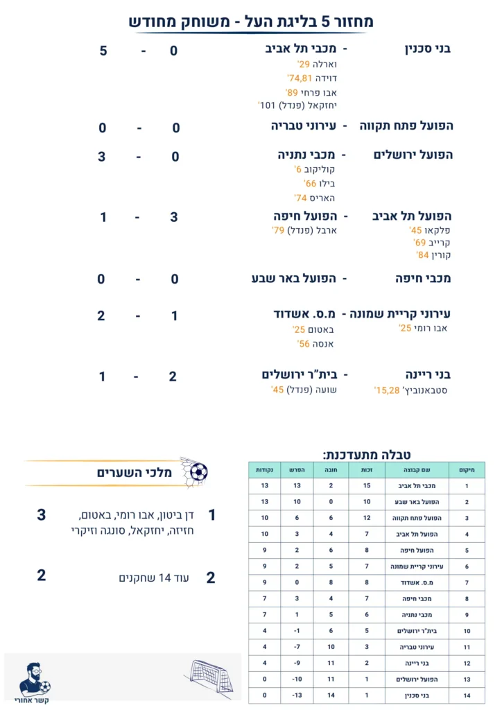 מה לגבי התחתית? על סכנין כבר דיברנו, הגיע הזמן להזכיר את הפועל ירושלים. המשחק של הירושלמים בבית מול נתניה היה בשליטה נתנייתית מוחלטת, ואמנם ש3-0 זו תוצאה די גבוהה, אבל 2-0 היה משקף מאוד. זה המקום להזכיר שפתיחת העונה של הפועל ירושלים הייתה רעה מאוד, והם יצטרכו להשתפר מאוד במחזורים הבאים בשביל סיכוי במאבק על הישרדות בליגה. האם האדומים מירושלים יצליחו? נגלה במחזורים הקרובים.