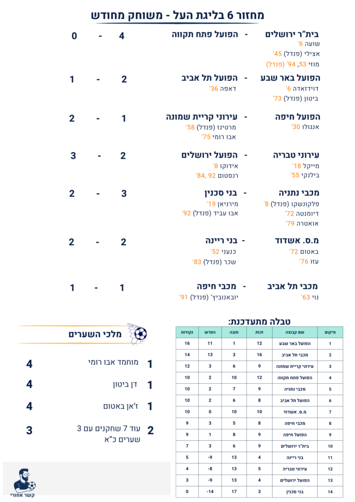 הפועל באר שבע ניצלה את התיקו עד תום עם ניצחון 1-2 על הפועל תל אביב. דוידזאדה פתח אחרי מסירה גדולה של מתן בלטקסה. דניאל דאפה ניצל הרחקה לא טובה של מרציאנו בשביל להגיע ל1-על-1 ולכבוש, אבל דן ביטון חתם את תוצאת הסיום בפנדל מוצלח. האדומים מהנגב חוזרים למקום הראשון.