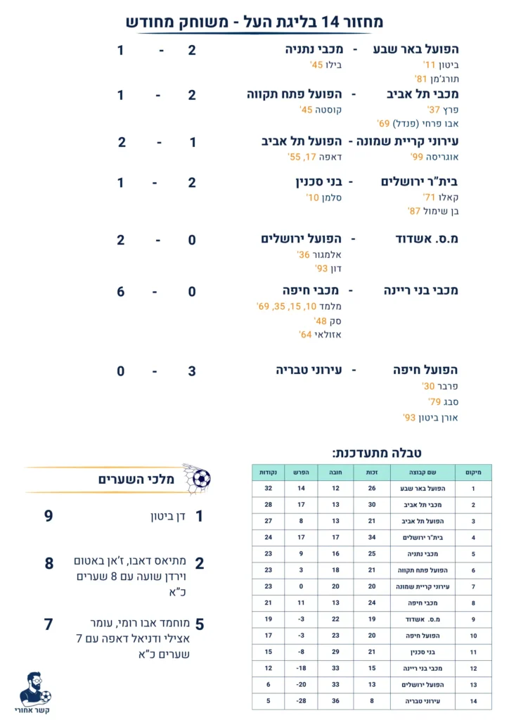במחזור הבא: באר שבע בטבריה, מכבי תל אביב בנתניה, הפועל תל אביב מארחת את בני ריינה ומה שנתפס לפני העונה כאחד ממשחקי העונה – מכבי חיפה מארחת את בית"ר ירושלים – הוא כרגע מאבק על המקום בפלייאוף העליון