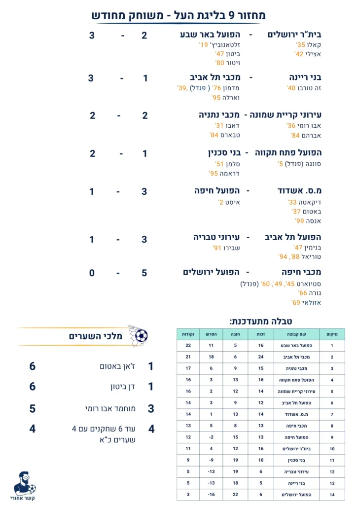 והצגת הסיבוב שייכת לטריוונטה סטיוארט ממכבי חיפה. שלושה שערים בתוך 19 דקות (45+1', 49', 60'), כאשר השלישי בפנדל, בדרך ל-5-0 על הפועל ירושלים. גורה ואזולאי הוסיפו. ירושלים עם 3 נקודות מ-9 משחקים, במשבר עמוק.