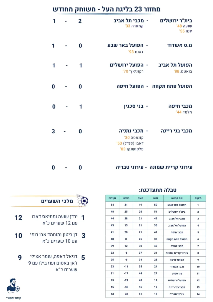 במחזור הבא: באר שבע יכולה להגדיל את הפער כשתארח את הפועל חיפה, בזמן שבית"ר תתארח בנתניה. בתחתית משחק גורלי בין טבריה ובני ריינה, ובמרכז הטבלה מכבי חיפה תנסה לפתוח פער מהפועל פתח תקווה.