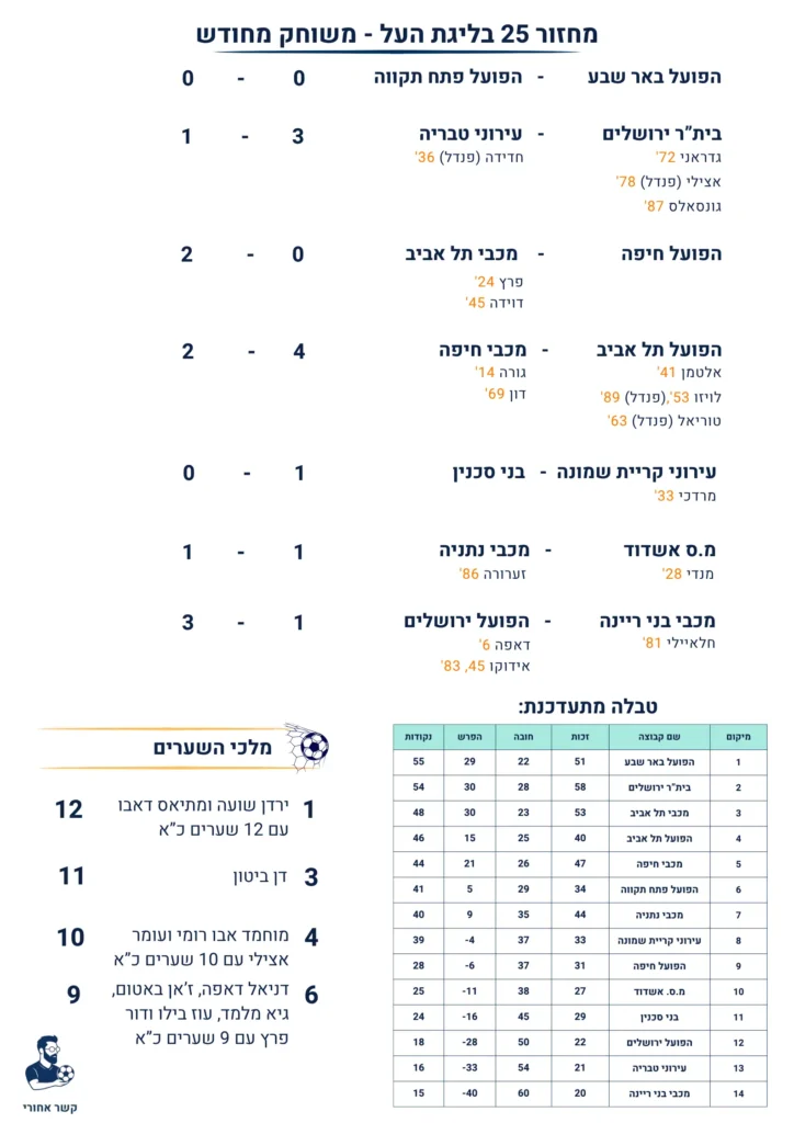 הפער בצמרת מצטמצם לנקודה בלבד: הפועל באר שבע מועדת, בית"ר ירושלים מנצלת את ההזדמנות הפועל באר שבע, מוליכת הטבלה, איבדה שתי נקודות יקרות בבית מול הפועל פתח תקווה במשחק שהסתיים ב-0:0 מאכזב. שתי הקבוצות התקשו לייצר מצבים. הפועל באר שבע הייתה עדיפה קלות ב-xG הכולל (0.95 מול 0.8), אבל המצב המסוכן ביותר היה דווקא של המלאבסים, כאשר דיארה קיבל בדקה ה-83 כדור נפלא מקוסטה ופרץ עד לרחבה אבל בעט החוצה. עוד מחזור בפסגה להפועל באר שבע, אבל ההתקפה חייבת לעלות רמה ללא דן ביטון כדי להמשיך ולהיות הפייבוריטית לתואר העונה.