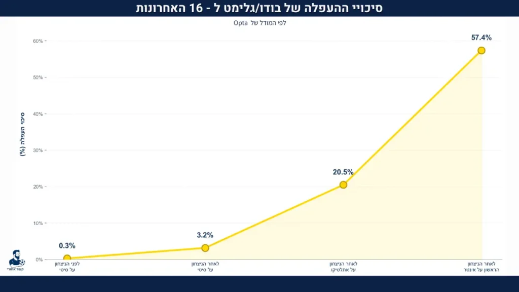 שני מחזורים לפני סיום הליגה, המודל הסטטיסטי של חברת Opta (חברת האנליטיקה המובילה בתחום) העניק להם רק 0.3% לעלות לשלב הבא. ולפתע, בודו פתחו מבערים וניצחו את סיטי, אתלטיקו בחוץ וניצחון כפול על אינטר שהעלה אותם ל-16 האחרונות.