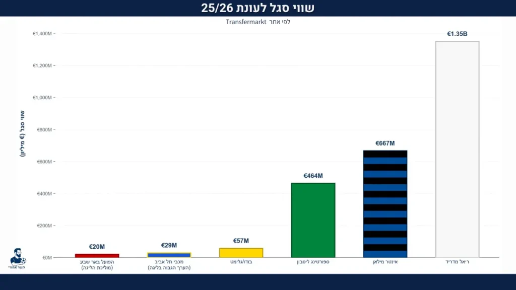 בתמונה: שווי הסגל של בודו לעומת קבוצות צ'מפיונס ליג והליגה הישראלית. שווי סגל הוא לא תקציב, והוא מושפע בין היתר מהיוקרה של קבוצה, אבל הוא מדד נוסף לאיכות השחקנים