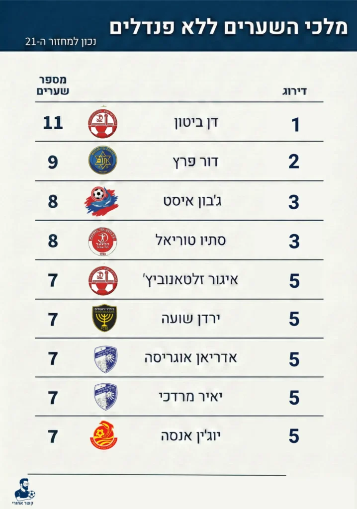 טבלת מלכות השערים הנוכחית – עד למחזור 21 – הייתה נראית שונה מאוד אם לא היינו כוללים בה פנדלים. דן ביטון עדיין מוביל, אבל המירוץ הרבה יותר צמוד. שחקנים שמשיגים את השערים שלהם כתוצאה מיכולת לנוע ולמקם את עצמם נכון – כמו דור פרץ – מקבלים את הקרדיט שמגיע להם. לעומת זאת, המאזן של שחקנים כמו טריוונטה סטיוארט משקף טוב יותר את העונה שלו. במקום מאזן סביר של 8 שערים ב-20 משחקים, חלוץ הרכש היקר של מכבי חיפה עומד עכשיו על 5 שערים בלבד ב-20 משחקים. האם זה לא הולם טוב יותר את הביצועים שלו?