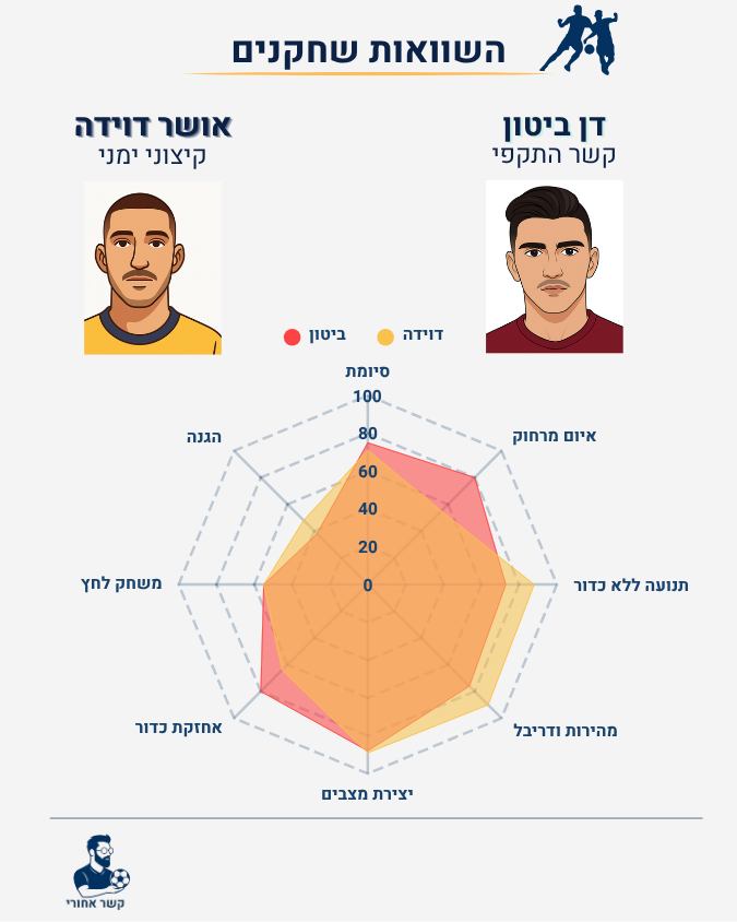 שניהם הקשרים ההתקפיים באגף הימני של שתי הקבוצות הטובות בליגה. שניהם שווים 2 מיליון יורו ב-transfermakrt, הנתונים שלהם לא רחוקים אחד מהשני והם בטופ של השחקנים הישראליים בארץ. נכנסנו לעומק כדי לנסות להבין האם אפשר לקבוע מי שחקן טוב יותר - אושר דוידה או דן ביטון?